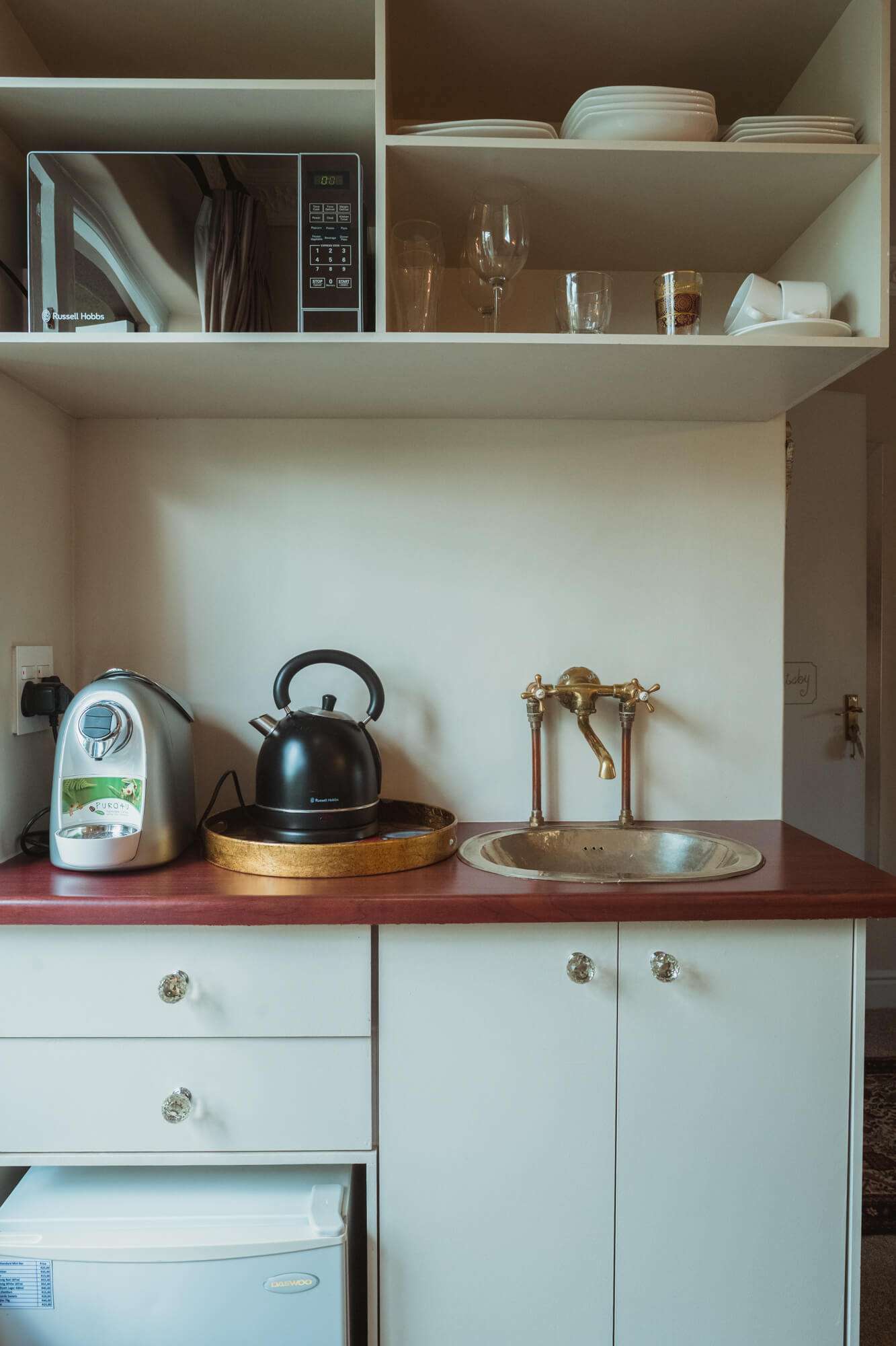 Shiny, metallic, ornamental, lace, silk, drama and brilliant contrasts. This room has a kitchenette with a microwave, sink, fridge, cutlery and crockery.