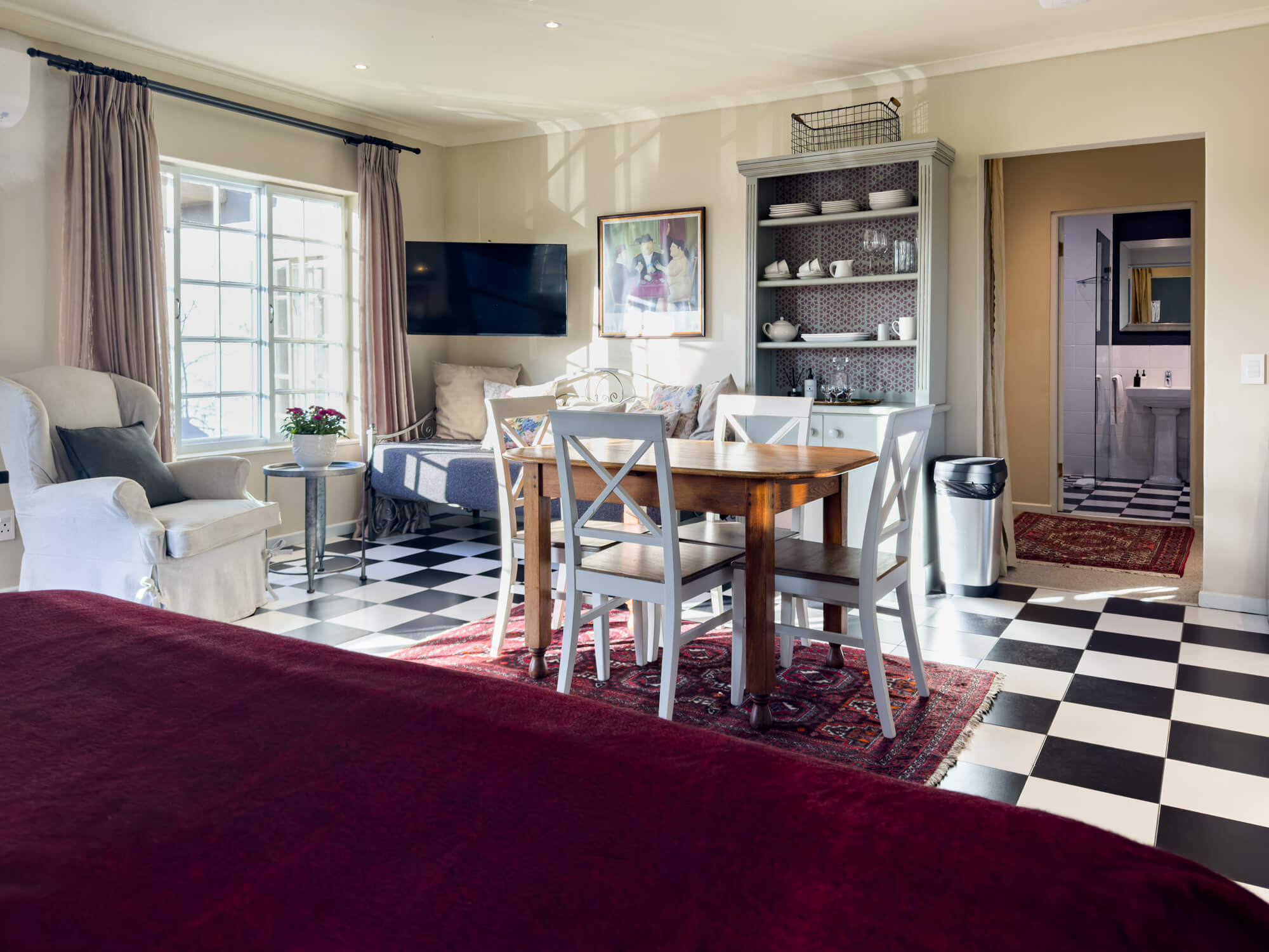 This stylish sunny room in black and grey with a touch of red is a favourite of many guests. This room is on ground level, with French doors on the patio adjacent to the swimming pool.